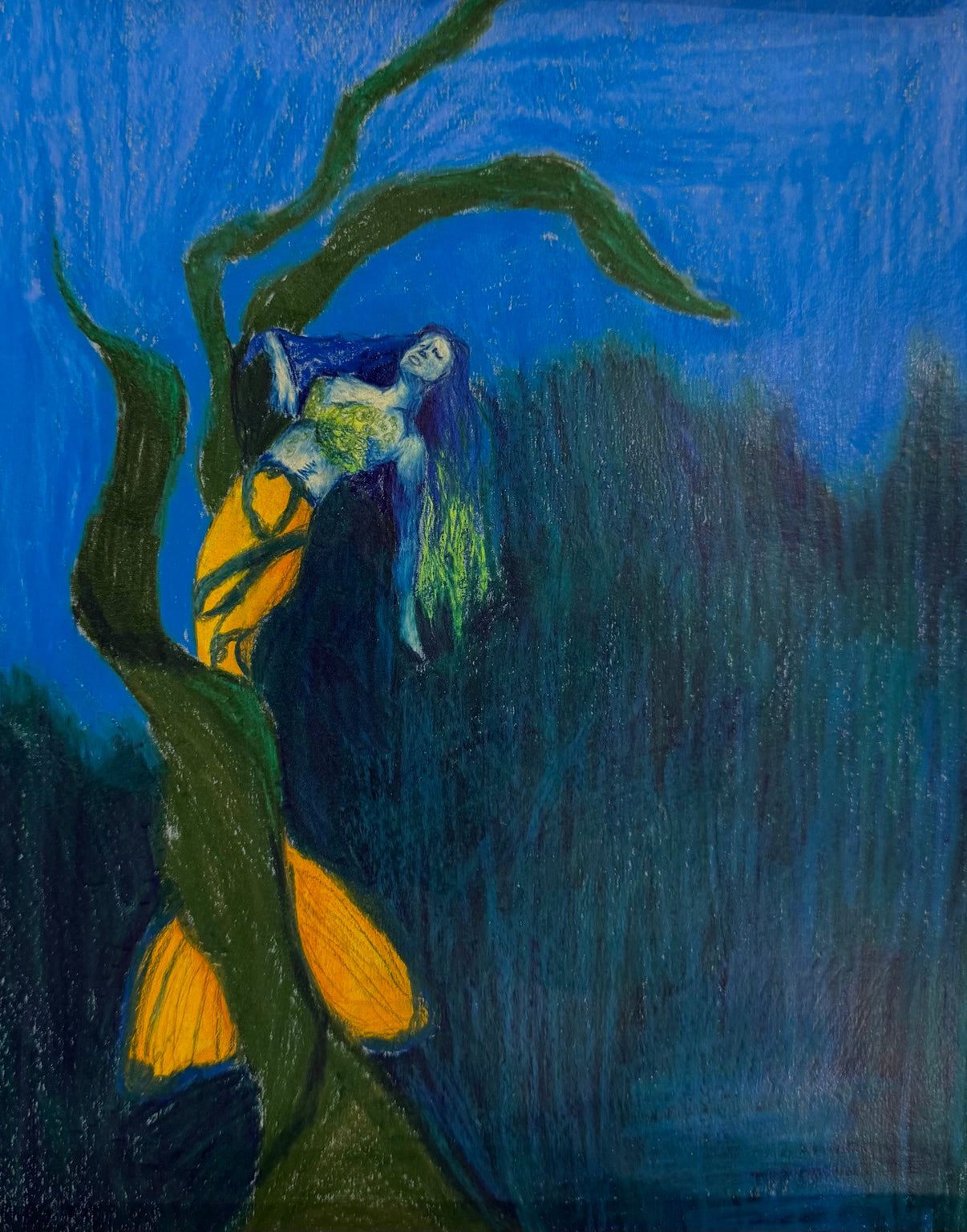 “Kelpbound Slumber” is an 8x10 matted mermaid art print featuring a peaceful underwater scene with flowing kelp.