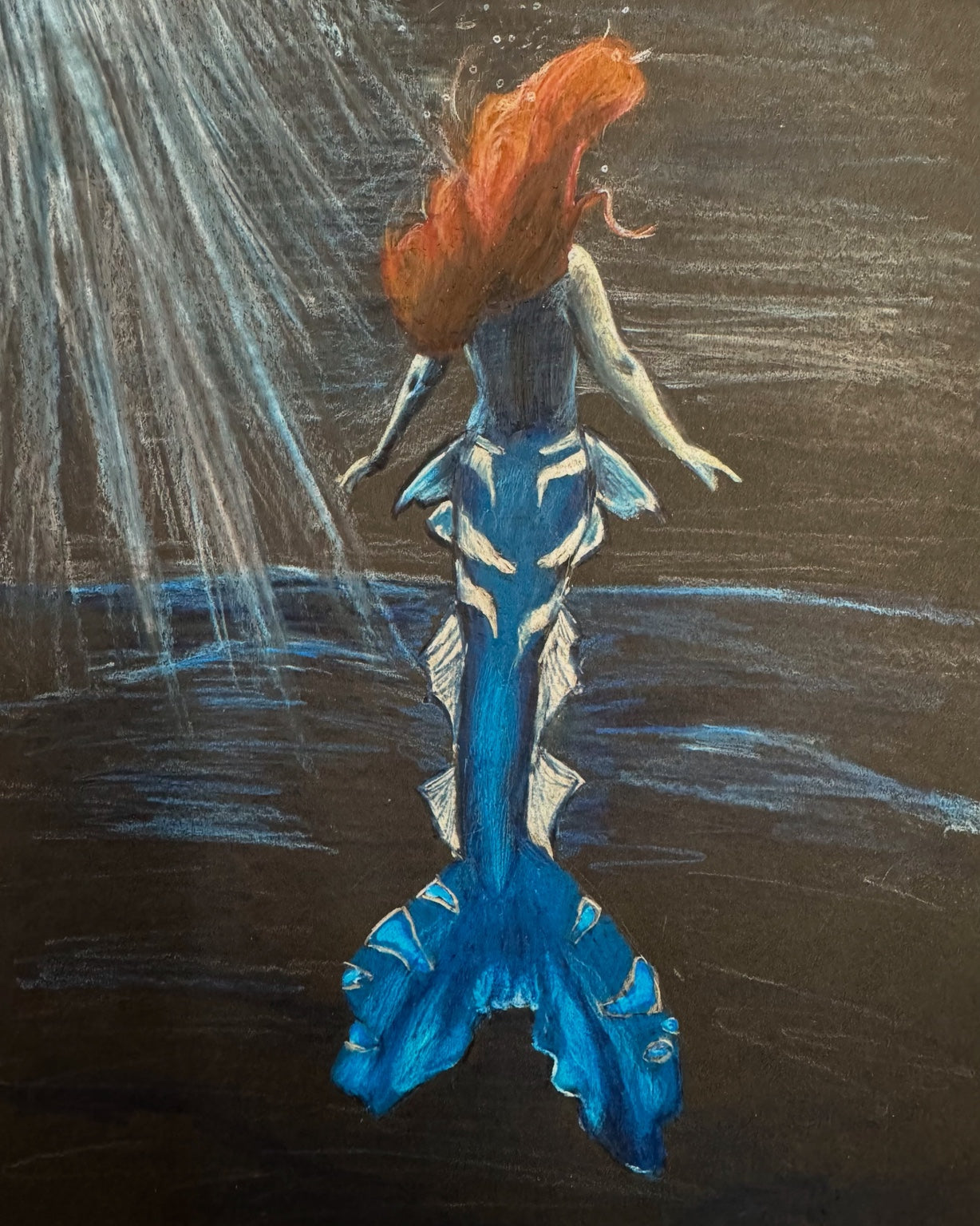 “Midnight Descent” is an 8x10 matted mermaid art print capturing a dive into shadowed waters. Deep tones and strong contrast create a bold, atmospheric piece.