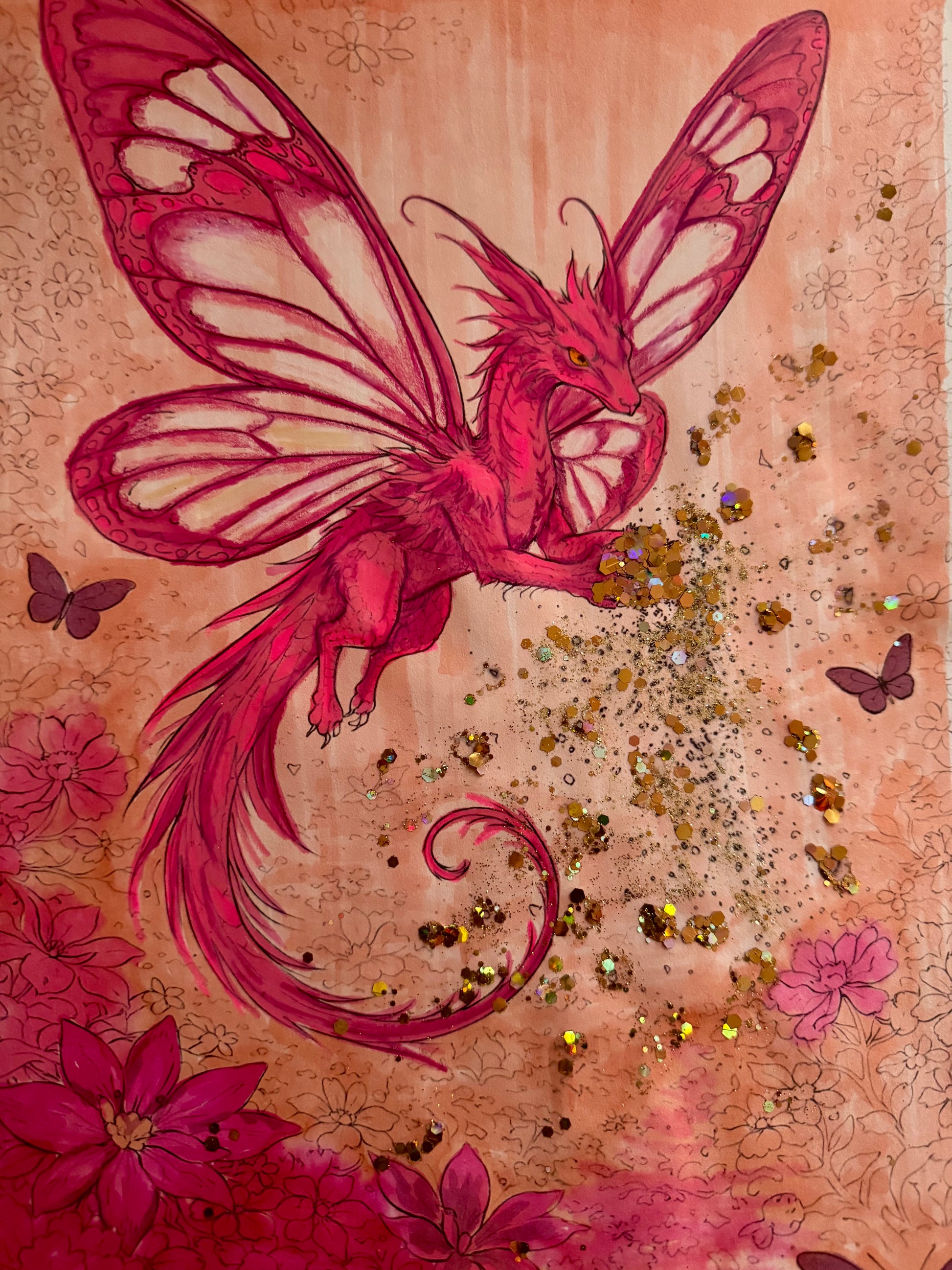 This print depicts a winged dragon intertwined with flowering branches, moving lightly through its surroundings. It is often chosen by those drawn to quiet shifts, gentle beginnings, and unseen growth.